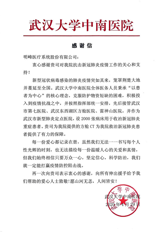 4月29日,明峰醫(yī)療收到了武漢大學(xué)中南醫(yī)院的感謝信,感謝明峰醫(yī)療對(duì)抗擊新冠疫情的貢獻(xiàn)以及對(duì)醫(yī)院工作的關(guān)心和支持。