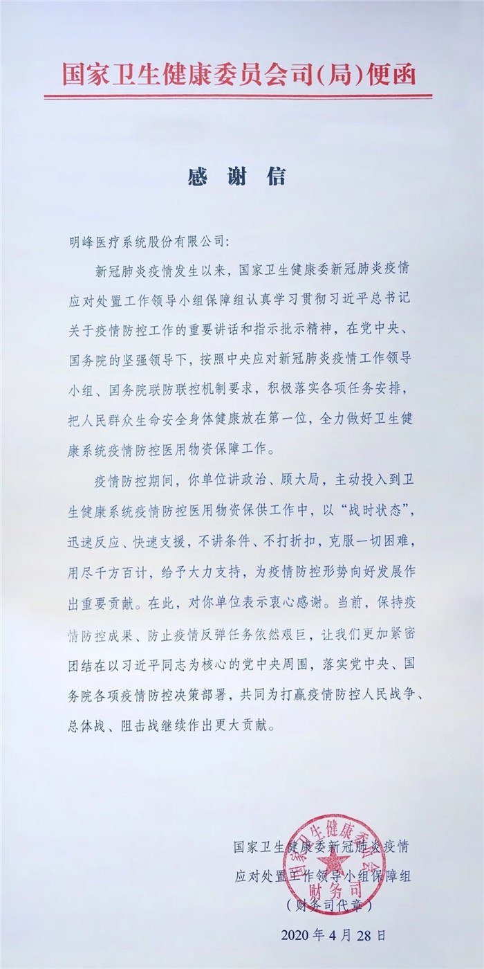 2020年4月28日,國家衛(wèi)生健康委員會(huì)向明峰醫(yī)療發(fā)來了感謝信,感謝明峰醫(yī)療講政治、顧大局,主動(dòng)投入到衛(wèi)生健康系統(tǒng)疫情防控醫(yī)用物資保供工作中,以“戰(zhàn)時(shí)狀態(tài)”,迅速反應(yīng)、快速支援,不講條件、不打折扣,克服一切困難,用盡千方百計(jì),給予大力支持,為疫情防控形勢向好發(fā)展做出重要貢獻(xiàn)。
