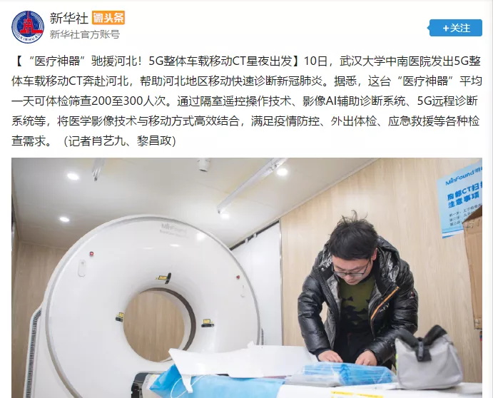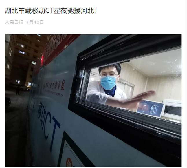 1月10日晚,央視新聞直播介紹了由武漢大學(xué)中南醫(yī)院馳援河北的明峰醫(yī)療車載CT。人民日?qǐng)?bào)、新華社等媒體也做出相關(guān)報(bào)道。