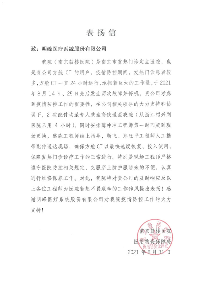 近日,明峰醫(yī)療收到了一份來自南京鼓樓醫(yī)院的表揚(yáng)信。感謝明峰醫(yī)療售后服務(wù)的快速響應(yīng)!感謝工程師們?cè)谝咔槠陂g不畏艱辛穿防護(hù)服維護(hù)設(shè)備!感謝明峰醫(yī)療一直以來對(duì)該院疫情防控工作的大力支持!